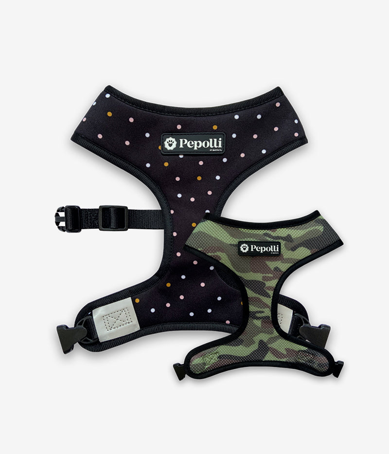 Nuestro arnés 2-EN-1 para perros está impreso con excelentes diseños en ambos lados, por lo que puedes usarlo por el lado que desees.